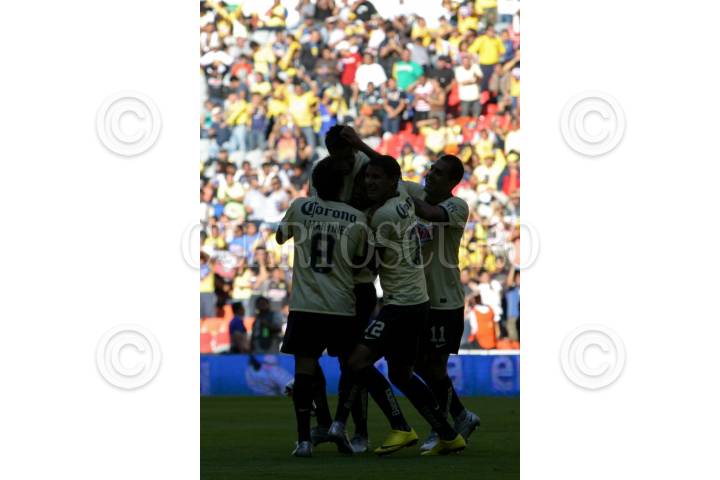 MÉXICO D.F., 21FEBRERO2010.- Jugadores de las Aguilas del America festejan el gol anotado por Luis Sandoval en el partido en contra de los tigres del Nuevo León. Partido que quedo empatado a 2 goles en el estadio Azteca de la jornada 7 del torneo Bicentenario 2010. FOTO: RODOLFO ANGULO/CUARTOSCURO.COM