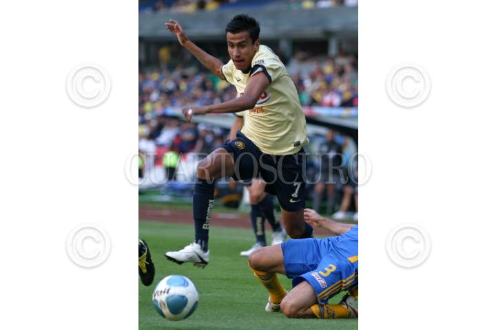 MÉXICO D.F., 21FEBRERO2010.- Antonio Lopez de las Aguilas del America corren con el balón durante el partido en contra de los tigres del Nuevo León. Partido que quedo empatado a 2 goles en el estadio Azteca de la jornada 7 del torneo Bicentenario 2010. FOTO: RODOLFO ANGULO/CUARTOSCURO.COM