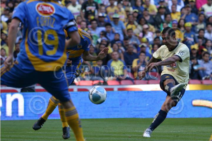 MÉXICO D.F., 21FEBRERO2010.- Daniel Montenegro de las Aguilas del America tira a la porteria durante el partido en contra de los tigres del Nuevo León. Partido que quedo empatado a 2 goles en el estadio Azteca de la jornada 7 del torneo Bicentenario 2010. FOTO: RODOLFO ANGULO/CUARTOSCURO.COM