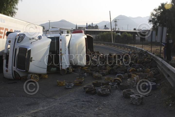 ECATEPEC ESTADO DE MÉXICO, Un tráiler que transportaba cilindros de gas reciclados se volcó sobre la avenida Recursos Hidráulicos en la incorporación a la autopista Lechería Texcoco dejando un saldo de dos personas lesionadas. FOTO: CORTESIA EDUARDO GALINDO /CUARTOSCURO.COM