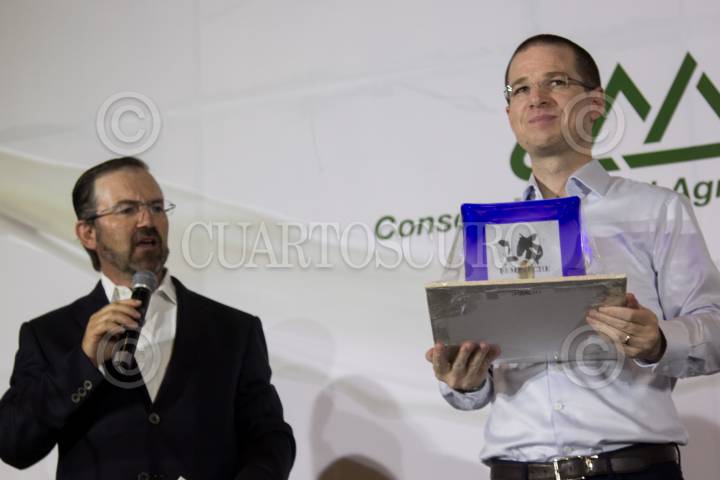 CIUDAD DE MÉXICO, 24ABRIL2018.- Vicente Gómez Cono, presidente de la Federación Mexciana de Lechería, y Ricardo Anaya, candidato a la presidencia de la República por la coalición “Por México al Frente”, durante su participación en el tercer foro Nacional de Lechería, en el Casino del Campo Marte. FOTO: GALO CAÑAS /CUARTOSCURO.COM