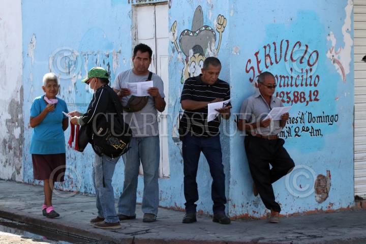 Unos hombres leen un volante de información sobre la termoeléctrica de Huexca que es repartido por un opositor a su funcionamiento.