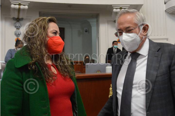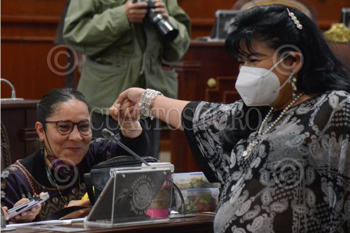 Valentina Valia Batres, diputada de Morena saluda a su compañera de bancada Marisela Zúñiga Cerón, sesión ordinaria del Congreso de la Ciudad de México.