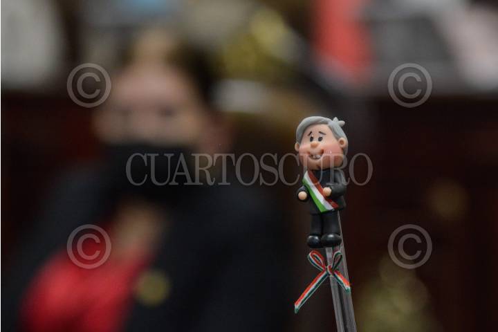 Una decoración de pluma alusiva a Andrés Manuel López Obrador, presidente de México, permanece en un curul de diputados de Morena durante la sesión ordinaria del Congreso de la Ciudad de México.