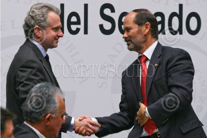 MÉXICO, D.F., 13AGOSTO2008.- El senador Santiago Creel y Gustavo Madero al termino de la instalación del consejo consultivo del Instituto de Investigaciones Legislativas del Senado de la República "Belisario Domíngez" que se realizo en el patio central del Senado. FOTO: RODOLFO ANGULO/CUARTOSCURO.COM