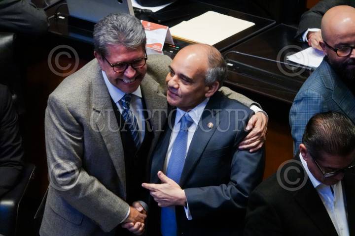 CIUDAD DE MÉXICO, 20JUNIO2025.- Ricardo Monreal, coordinador de Morena en la Cámara de Diputados, y Manuel Añorve Baños, coordinador del PRI en el Senado, se saluda durante la sesión de la Comisión Permanente en la Cámara de Senadores. FOTO: GALO CAÑAS/CUARTOSCURO.COM