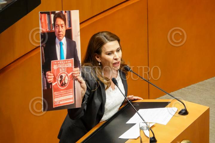 CIUDAD DE MÉXICO, 20JUNIO2025.- La senadora priista Carolina Viggiano muestra una imagen de Mario Delgado, actual secretario de Educación Pública, durante su uso de la tribuna en la sesión de la Comisión Permanente en la Cámara de Senadores. FOTO: GALO CAÑAS/CUARTOSCURO.COM