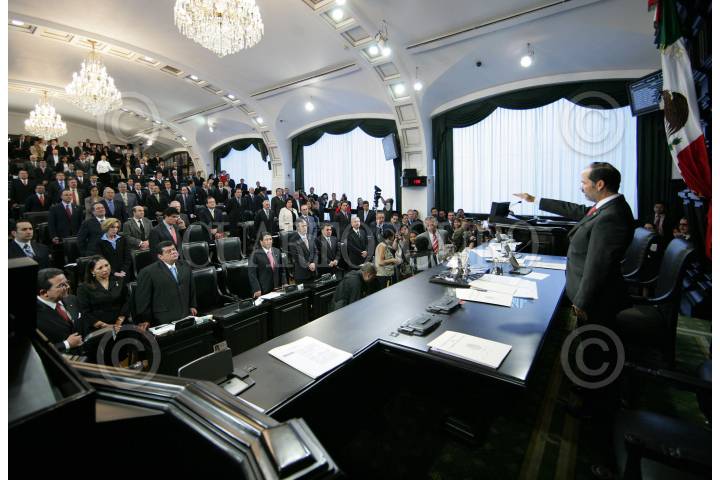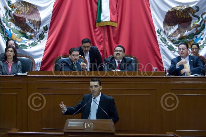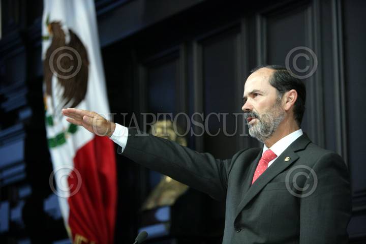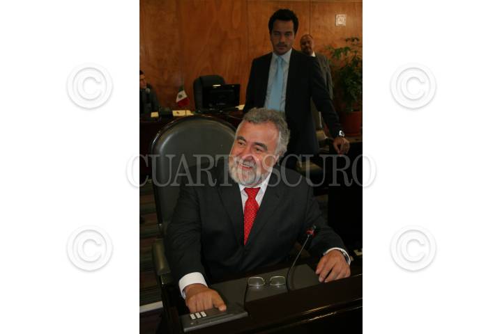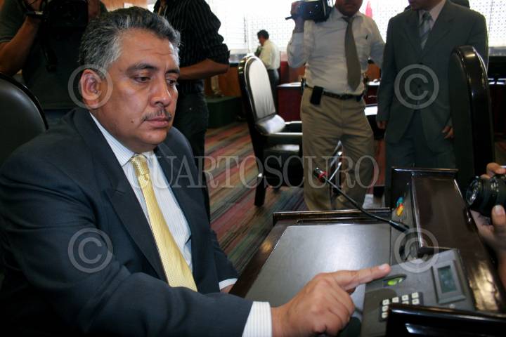 QUERETARO, QUERETARO, 16OCTUBRE2009.- Marcos Aguilar, diputado panista en su primer día de sesiones de la LVI legislatura donde amenazaron con abandonar el recinto después del receso a la que se erigiría al presidente y secretario de la junta de concertacion política, así como la creación e integración de la comisión especial para reformar la ley orgánica del poder legislativo del Estado. Sesión enmarcada por la nueva disposición de racionar la entrada a periodistas al salón de sesiones. FOTO: DEMIAN CHAVEZ/CUARTOSCURO.COM
