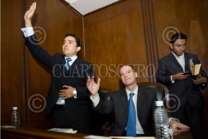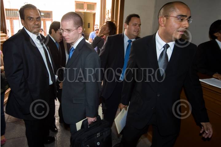 QUERETARO, QUERETARO, 16OCTUBRE2009.- Gerardo Cuanalo, Marcos Aguilar, Ricardo Anaya, Juan Fernando Rocha, diputados panistas en su primer dia de sesiones de la LVI legislatura donde amenazaron con abandonar el recinto después del receso a la que se erigiría al presidente y secretario de la junta de concertacion política, así como la creación e integración de la comisión especial para reformar la ley orgánica del poder legislativo del Estado. Sesión enmarcada por la nueva disposición de racionar la entrada a periodistas al salón de sesiones. FOTO: DEMIAN CHAVEZ/CUARTOSCURO.COM