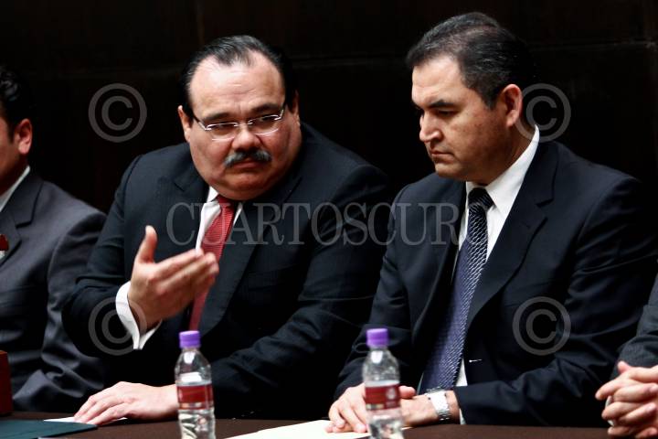 QUERÉTARO, QUERÉTARO, 04FEBRERO2011.- Ricardo Astudillo Martínez, Presidente de la Mesa Directiva del Congreso del Estado; Jorge Carlos Ramírez Marin, diputado presidente de la Cámara de Diputados en la Ciudad de México, durante la Clausura del Primer Foro Nacional de Presidentes de las Legislaturas de los Estados y de la Firma del Convenio de Colaboración entre estas instituciones del Estado. FOTO: MISAEL VALTIERRA/CUARTOSCURO.COM