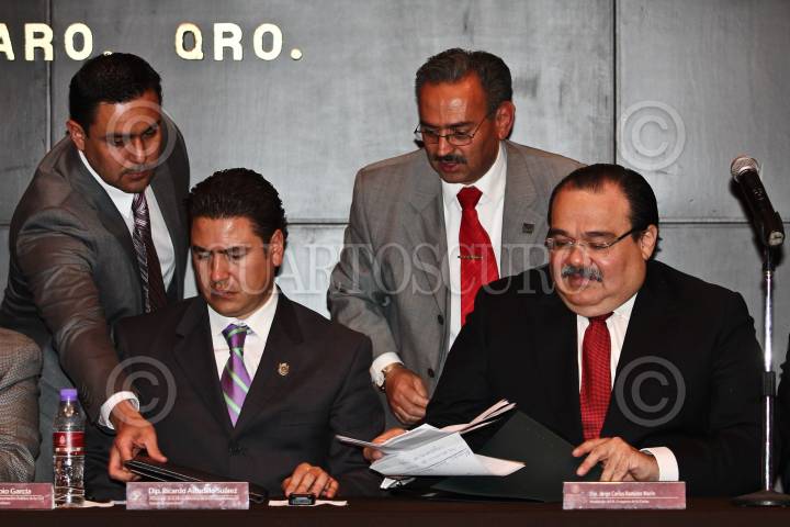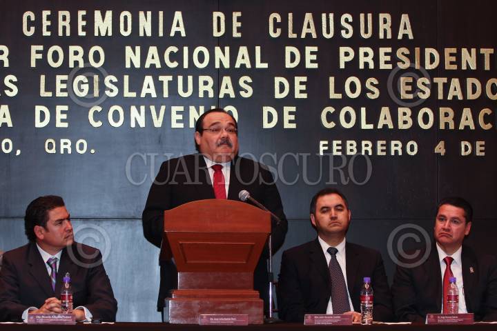 QUERÉTARO, QUERÉTARO, 04FEBRERO2011.- Eduardo Andráde Sánchez, Presidente de la Mesa Directiva del Congreso del Estado de Veracruz, Hiram Rubio García, diputado local del PRI en Queretaro, Ricardo Astudillo Martínez, Presidente de la Mesa Directiva del Congreso del Estado; Jorge Carlos Ramírez Marin, diputado presidente de la Cámara de Diputados en la Ciudad de México, Jualián Hernández Santillán, Subsecretario de Enlace Legislativo de la Secretaría de Gobernación, en representación del Presidente de la República, Felipe Calderón Hinojosa y Jorge Herrera Solorio, Magistrado Presidente del Tribunal Superior de Justicia del Estado de Querétaro, durante la Clausura del Primer Foro Nacional de Presidentes de las Legislaturas de los Estados y de la Firma del Convenio de Colaboración entre estas instituciones del Estado. FOTO: MISAEL VALTIERRA/CUARTOSCURO.COM