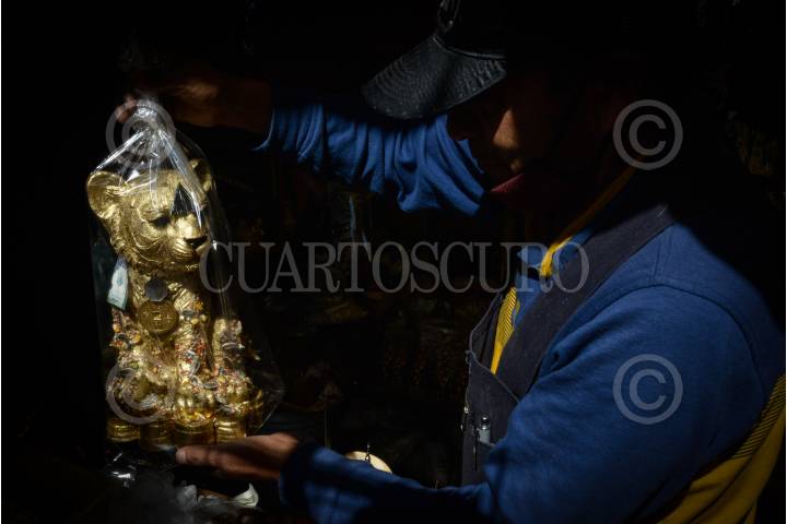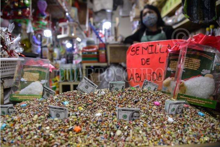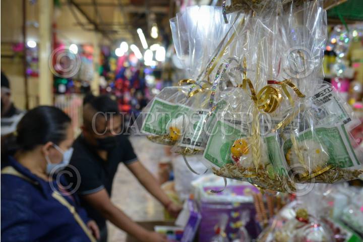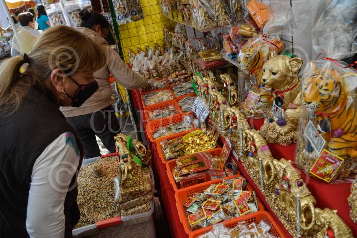 Personas asisten al mercado de Sonora para realizar compras de amuletos con motivo del Año Nuevo 2022. Los amuletos predominantes son el Tigre por el nuevo año chino, semillas de la abundancia y lencería de color amarillo o rojo.