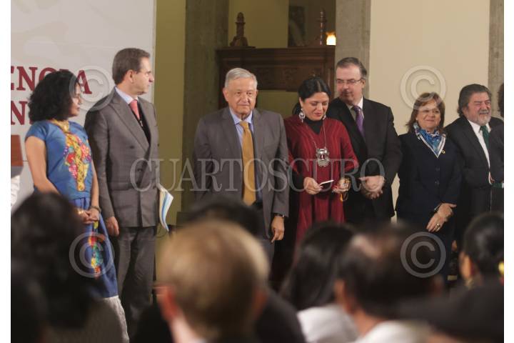 Andrés Manuel López Obrador, presidente de México, encabezó la Presentación del evento de alto nivel Construyendo un Decenio de Acciones para las Lenguas Indígenas Adelfo Regino Montes, Natalia Toledo, Esteban Moctezuma Barragán, Audrey Azoulay, Alejandra Frausto Guerrero, Marcelo Ebrard Casaubon, Martha Delgado, Rogelio Jiménez Pons