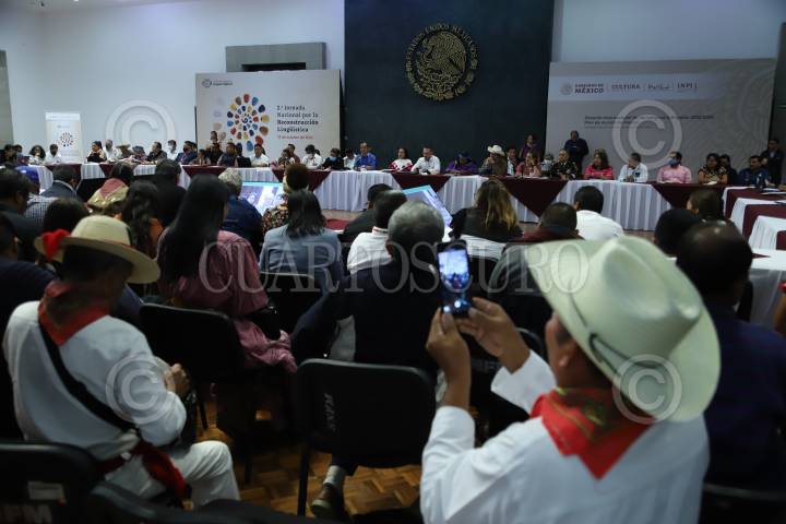Mesa de trabajo durante el lanzamiento del Plan de México para el Decenio Internacional de las Lenguas Indígenas 2022-2032, en el salón Adolfo López Mateos del Complejo Cultural Los Pinos.