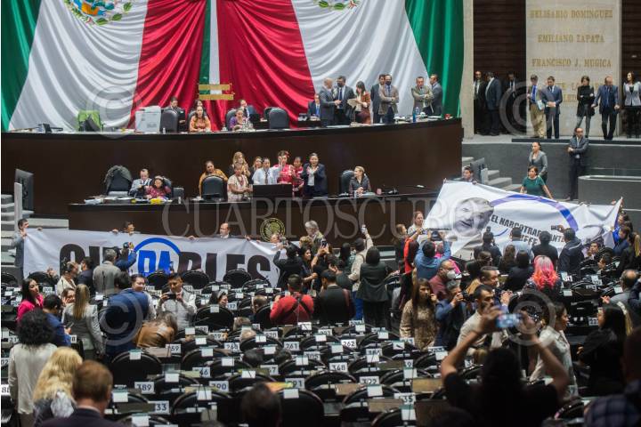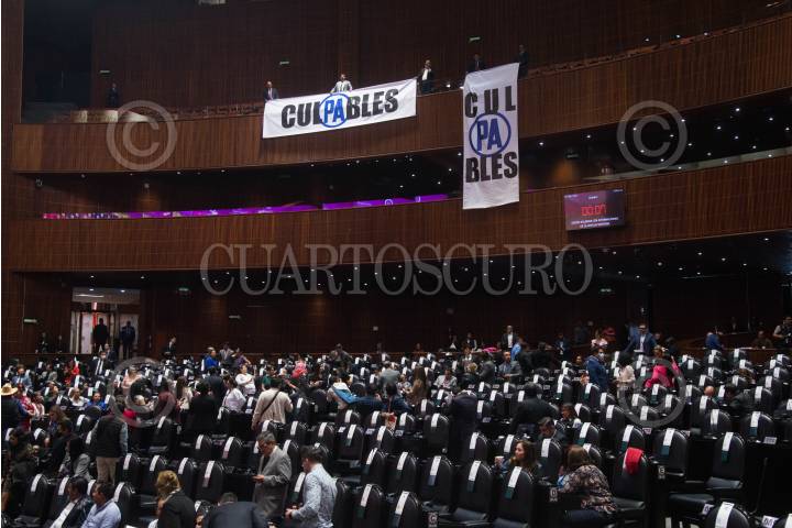 Durante la intervención de María del Rosario Reyes Silva, diputada de Morena, y compañeros de bancada, mostraron mantas en contra de Genaro García Luna, ex secretario de Seguridad Pública y recientemente declarado culpable por presuntos vínculos con el narcotráfico, así como de Felipe Calderón, ex presidente de México.