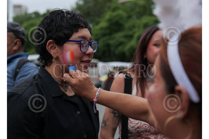 CIUDAD DE MÉXICO, 22JUNIO2024.- Una mujer pinta la cara de una joven con los colores de la bandera lésbica durante la Marcha Lencha que se realizó desde el Ángel de la Independencia hasta el Monumento a la Revolución. FOTO: ALICE MORITZ/CUARTOSCURO.COM