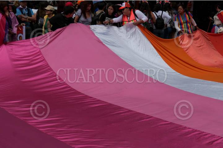 CIUDAD DE MÉXICO, 22JUNIO2024.- Varias personas sostuvieron una grande bandera lésbica durante la Marcha Lencha que se realizó desde el Ángel de la Independencia hasta el Monumento a la Revolución. FOTO: ALICE MORITZ/CUARTOSCURO.COM