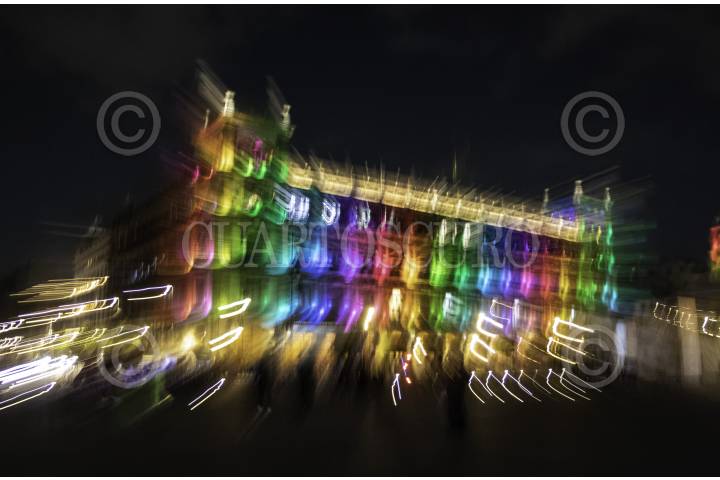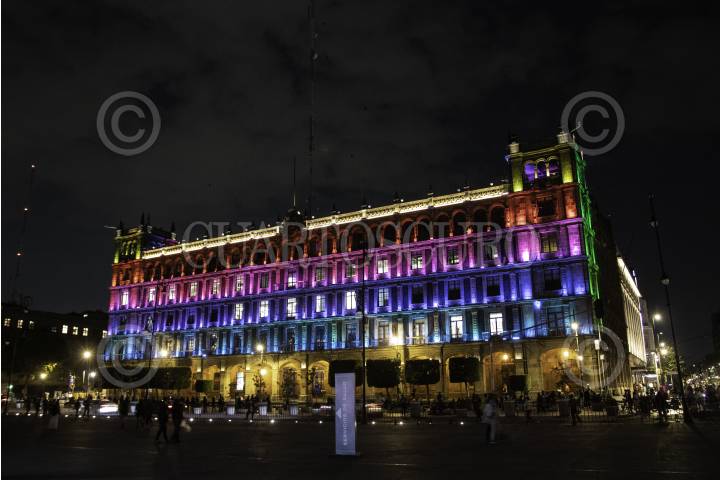 Los colores de la Bandera LGBT+ alumbran edificios y monumentos como el Antiguo Palacio de Ayuntamiento en marco del 17 de mayo Día internacional de la lucha contra la Homofobia, lesbofobia, Transfobia y Bifobia.