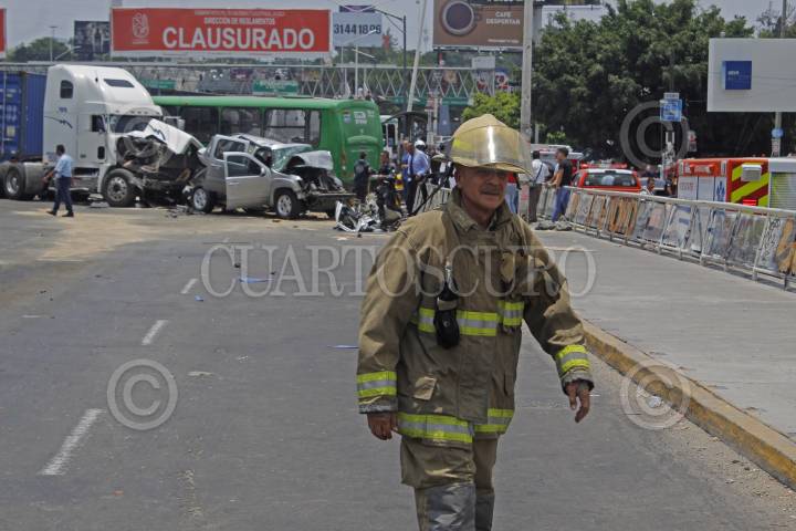 TLAQUEPAQUE, JALISCO, 06JUNIO2018.- Un accidente automovilístico se registro esta tarde a la altura del Fraccionamiento Revolución en la conocida carretera Guadalajara-Chapala, esto cuando un vehículo de carga se quedo sin frenos e impacto a los demás automotores que esperaban el paso para tomar la avenida Lázaro Cárdenas, en dicho accidente participaron dos tractocamiones, tres camiones de transporte urbano, dos taxis y una camioneta y según versiones de protección civil un saldo de 18 personas lesionadas. FOTO: CUARTOSCURO.COM