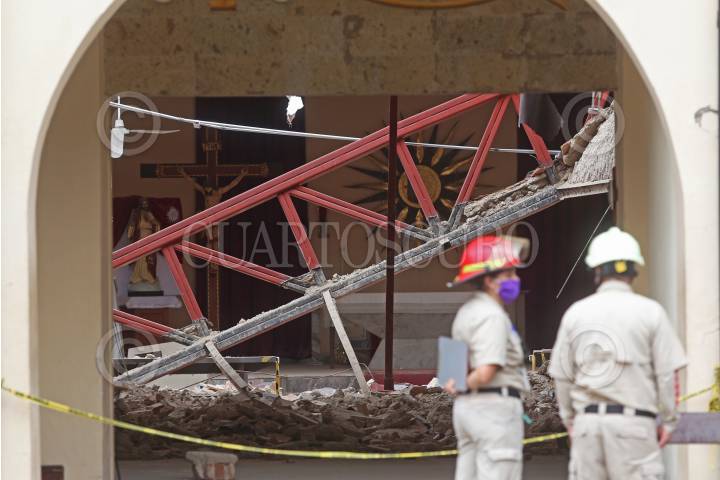 Bomberos de Zapopan evalúan daños tras derrumbarse el techo de la parroquia Corpus Christi, ubicado sobre la avenida Manuel J. Clouthier casi al cruce con la calle Sebastián Bach en la colonia Prados Vallarta y en donde se registraron 11 personas lesionadas.