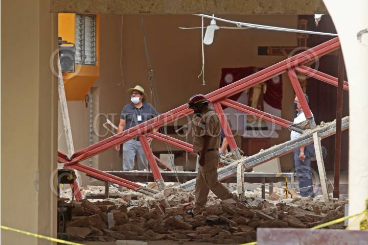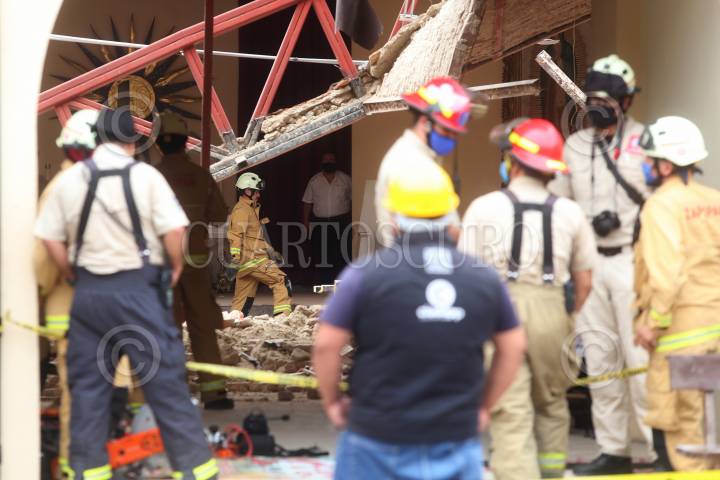 Personal de rescate realizan labores de búsqueda de personas tras derrumbarse el techo de la parroquia Corpus Christi, ubicado sobre la avenida Manuel J. Clouthier casi al cruce con la calle Sebastián Bach en la colonia Prados Vallarta, en donde se registraron 11 personas lesionadas.