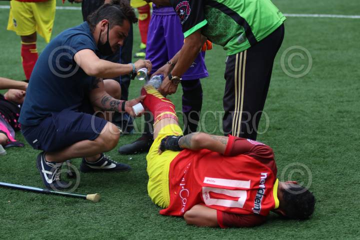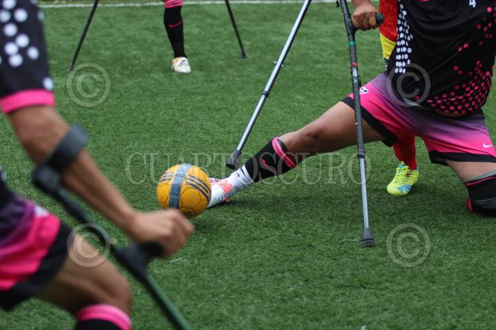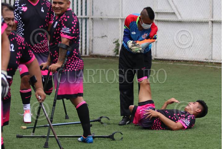 El jugador Hugo del equipo de "Chapulines" recibió agua en la exteemidad de su pierna amputada duurante una caída en el partido disputado con el equipo "Pumas Reto"