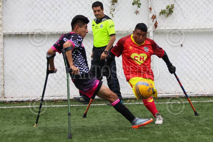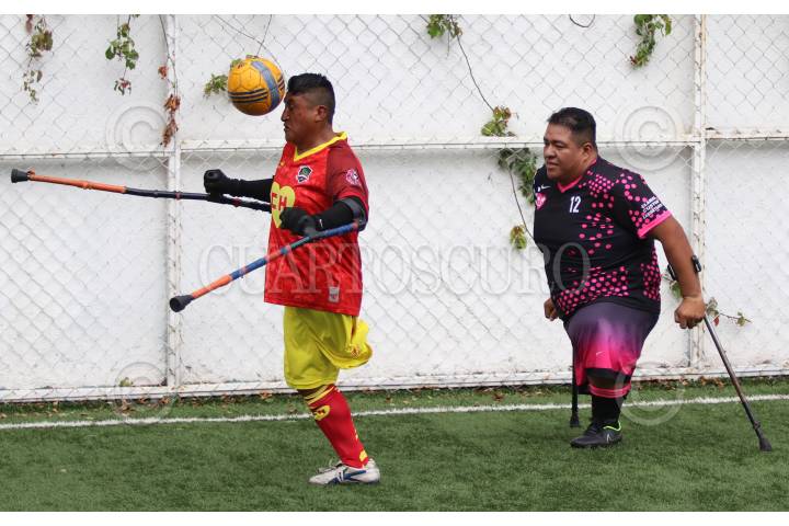 Dos jugadores con amputaciones en las piernas de los equipos "Chapulines" y "Pumas Reto", respectivamente, disputan un balón durante un partido en el Deportivo Valle Escandón
