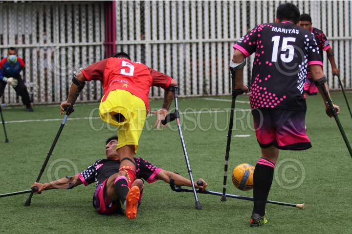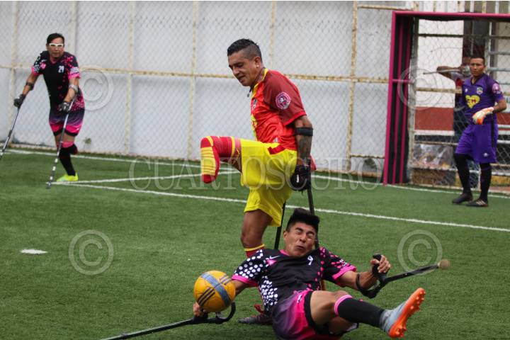 Dos jugadores con piernas amputadas de los equipos "Chapulines" y "Pumas Reto", respectivamente, disputan un balón durante un partido en el Deportivo Valle Escandón