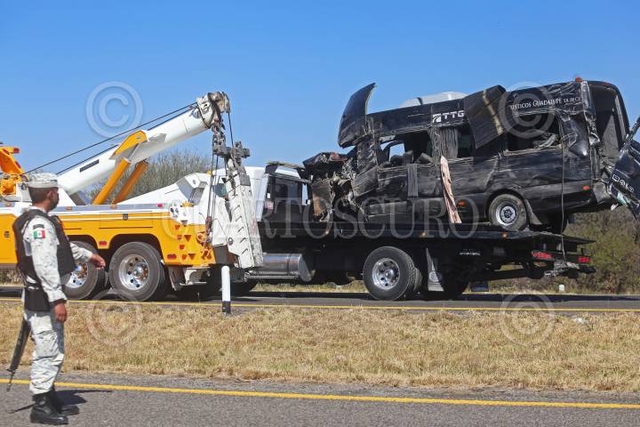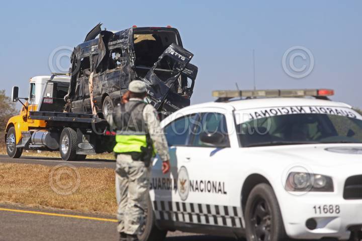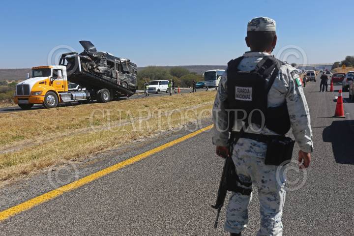 Un elemento de la Guardia Nacional, resguarda la carretera federal León – Aguascalientes Km 35, donde se registro un accidente automovilístico que dejo como saldo 13 personas fallecidas y 10 heridos de gravedad.