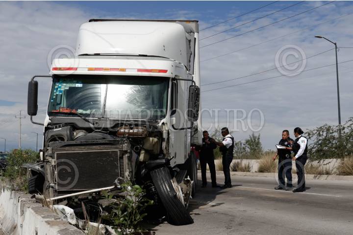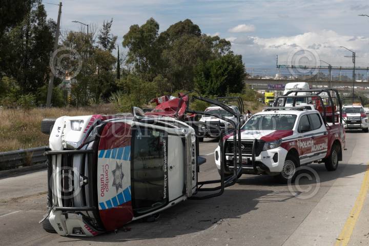 PUEBLA, PUEBLA, 15DICIEMBRE2023.- Una persecución por el robo de un trailer terminó con una patrulla volcada, tres civiles lesionados, un auto chocado y la detención de dos presuntos responsables. El suceso tuvo lugar en el Periférico Ecológico de la ciudad de Puebla. FOTO: MIREYA NOVO/CUARTOSCURO.COM
