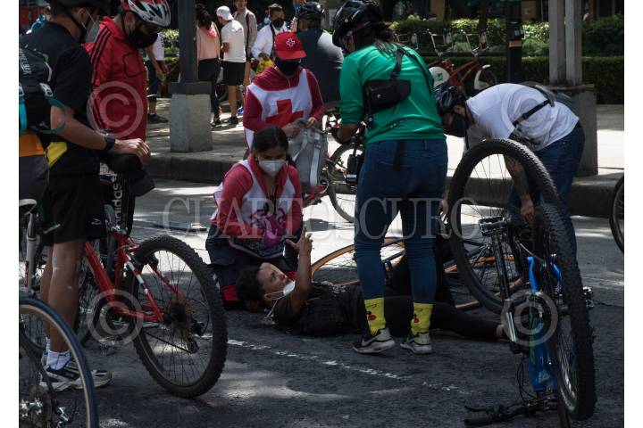 Una mujer se lesionó la cabeza al caer de su bicicleta en avenida Reforma, durante el Paseo Ciclista. Elementos de al Cruz Roja atendieron sus lesión en el lugar.