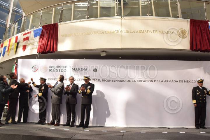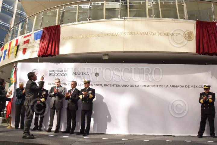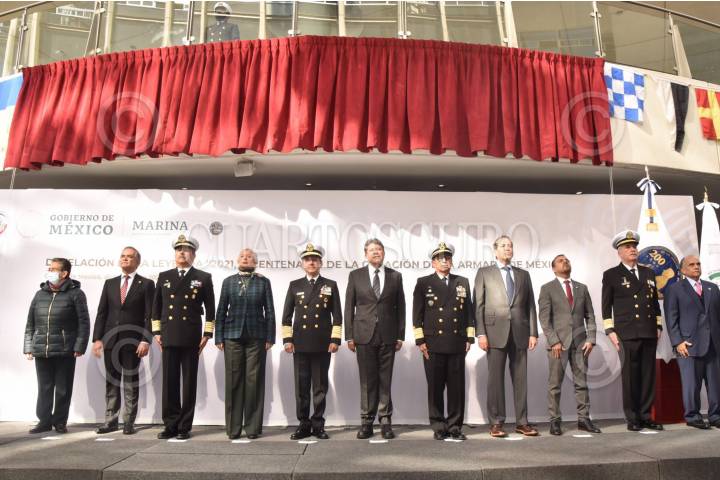 José Rafael Ojeda Durán, secretario de la Marina, encabezaron la develación de las letras doradas en reconocimiento a la Armada de México por 200 años de su creación.