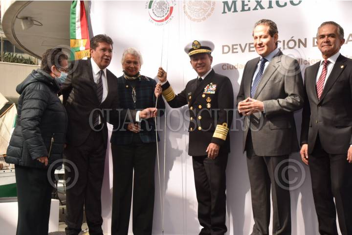 Olga Sánchez Cordero, Ricardo Monreal y José Rafael Ojeda Durán, encabezaron la develación de las letras doradas en reconocimiento a la Armada de México por 200 años de su creación.