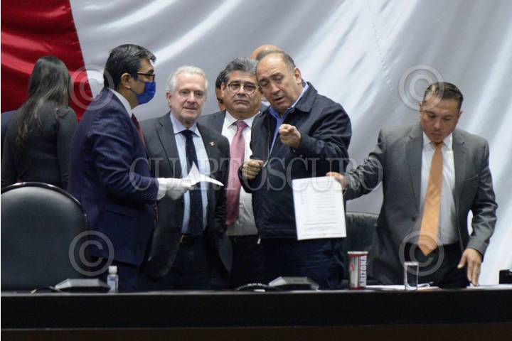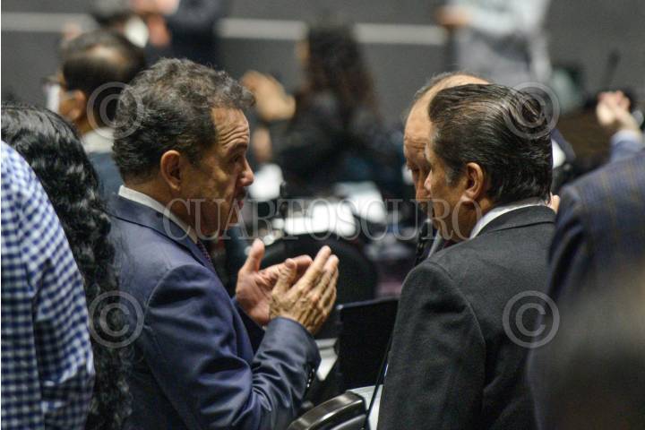 Ignacio Mier, diputado y coordinador de Morena, platica con Carlos Puente, coordinador del PVEM, y Leonel Godoy, diputado de Morena, durante la sesión solemne de la Cámara que Diputados.