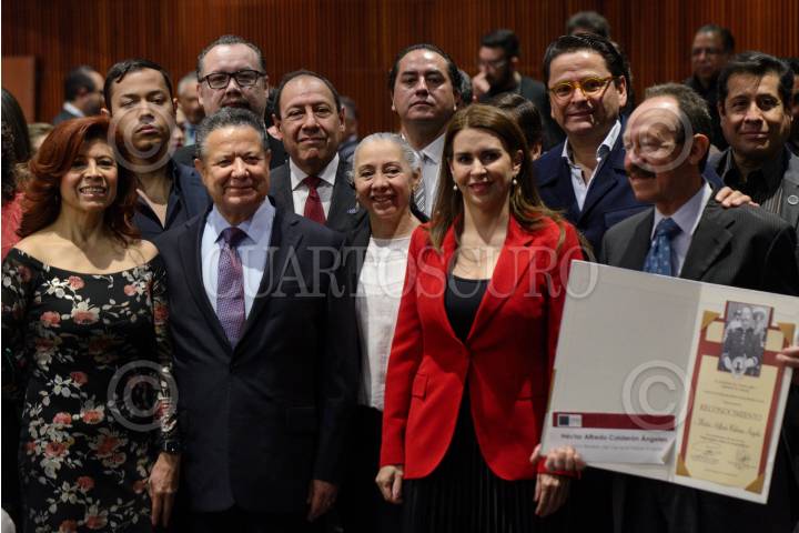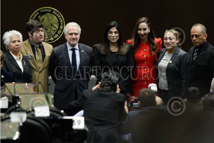 Santiago Creel, diputado presidente de la mesa directiva, junto a las vicepresidentas Marcela Guerra y Berenice Luna, posan junto a familiares de Gilberto Bosques, y Felipe Ángeles, durante la sesión solemne de la Cámara de Diputados.