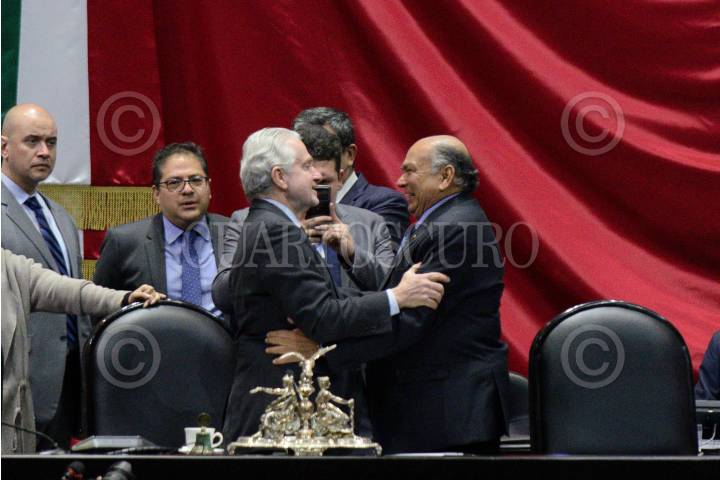 Santiago Creel, diputado presidente de la mesa directiva, y Antonio Pérez, diputado de Morena, durante la sesión solemne de Cámara de Diputados.