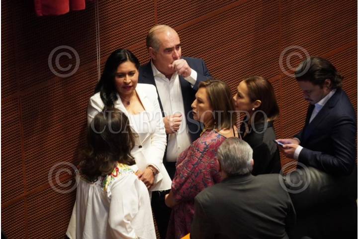 CIUDAD DE MÉXICO, 15NOVIEMBRE2023.- Ana Lilia Rivera, senadora de Morena, junto a los senadores panistas: Xóchitl Gálvez, Julen Rementería, y Josefina Vázquez Mota, durante la develación de inscripciones con letras doradas en el Muro de Honor por el "2023, Año del bicentenario del Heroico Colegio Militar" en el muro de honor durante la sesión plenaria de la Cámara de Senadores. FOTO: CUARTOSCURO.COM