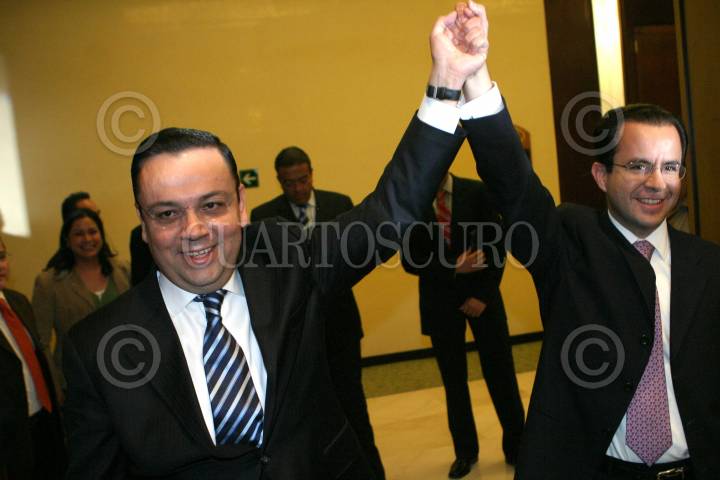MÉXICO,D,F.,05OCTUBRE2007.- Cesar Nava secretario particular de la presidencia levanta la mano de German Martínez Cazares durante la presentación oficial de Martinez Cazares a la presidencia del partido Acción Nacional. FOTO:SAÚL LÓPEZ/CUARTOSCURO.COM