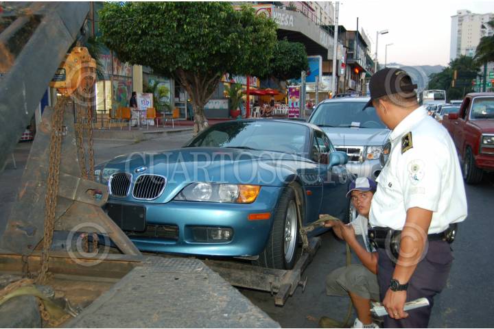 ACAPULCO, GUERRERO, 20FEBRERO2009.- Agentes de transito del ayuntamiento comenzaron por la tarde con el retiro de unidades mal estacionadas sobre la costera Miguel Alemán, para mejorar la imagen urbana ante la llegada de los jóvenes turistas extranjeros o "spring breakers" que vienen a vacacionar al puerto. FOTO: MARIO D. VALDEZ/CUARTOSCURO.COM