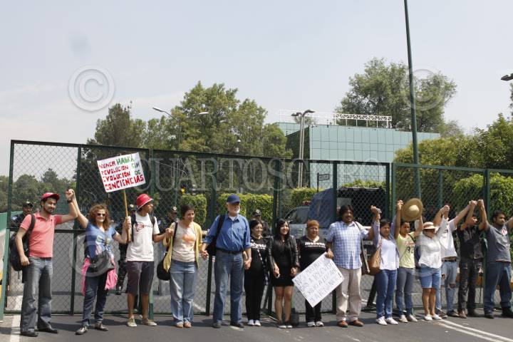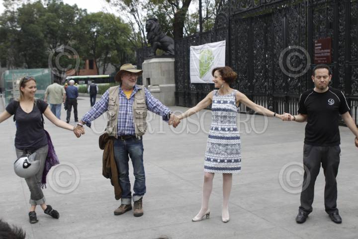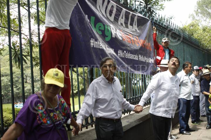 MÉXICO, DF., 26ABRIL2014.- Javier Corral, Javier Sicilia Cuauhémoc Cárdenas y Denise Dresser se integraron a la cadena humana contra las leyes secundarias de la Ley de Telecomunicaciones, la cual se intento formar de Los Pinos a Televisa Chapultepec y al final culminó con un mitin en el Senado . FOTO: MOISÉS PABLO /CUARTOSCURO.COM