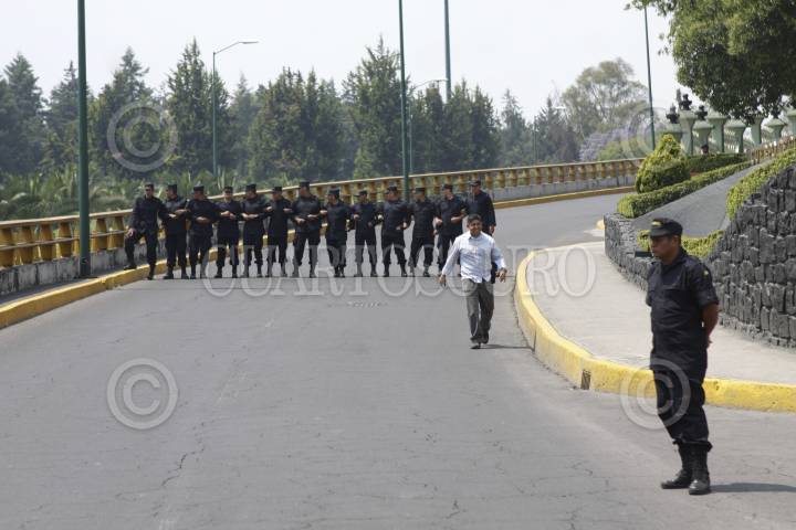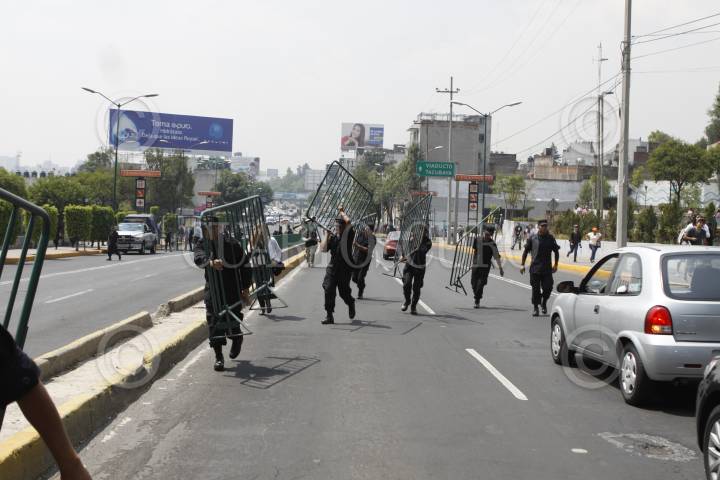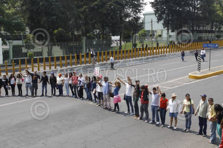 MÉXICO, DF., 26ABRIL2014.- Ciudadanos se reunieron en la entrada de la residencia Oficial de Los Pinos, ubicada en Parque Lira y Constituyentes, para encabezar una cadena humana en rechazo a las leyes secundarias de Ley de Telecomunicaciones que se discute en comisiones en el Senado de la República, los manifestantes acusan al gobierno de querer censurar los contenidos en Internet, elementos del Estado Mayor les impidieron el paso con vallas por lo que los manifestantes tuvieron que meterse al arrollo vehicular para poder bajar hacia la entrada de Chivatito y así poder reunirse con el grueso de los manifestantes. FOTO: MOISÉS PABLO /CUARTOSCURO.COM