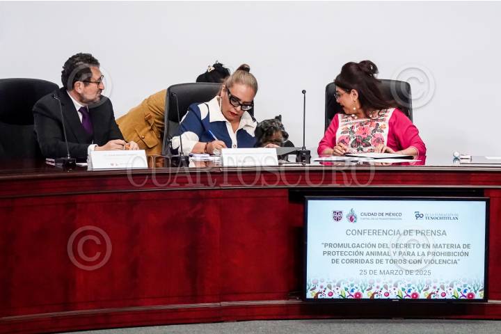 CIUDAD DE MÉXICO, 25MARZO2025.- César Cravioto, secretario de Gobierno de la Ciudad, Erendira Cruzvillegas, Consejera Jurídica y de Servicios Legales del gobierno capitalino, Clara Brugada, jefa de gobierno de la Ciudad de México, y Julia Álvarez Icaza, secretaria de Medio Ambiente capitalina, durante la “Promulgación del Decreto en materia de Protección Animal y para la Prohibición de Corridas de Toros con Violencia”. FOTO: GALO CAÑAS/CUARTOSCURO.COM