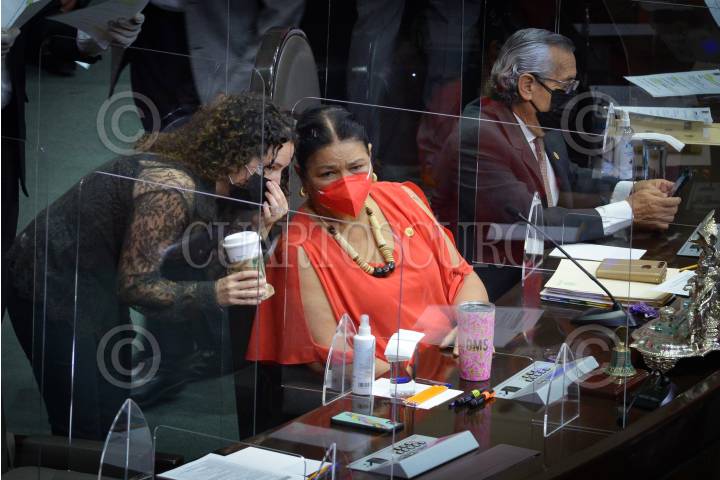 Lorena Villavicencio, diputada de Morena, platica con Verónica Juárez, diputada y coordinadora del PRD, durante la sesión ordinaria de la Cámara de Diputados en la que se somete a discusión la reforma a la Ley de la Fiscalía General de la República.