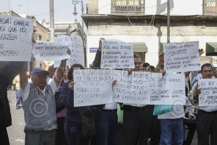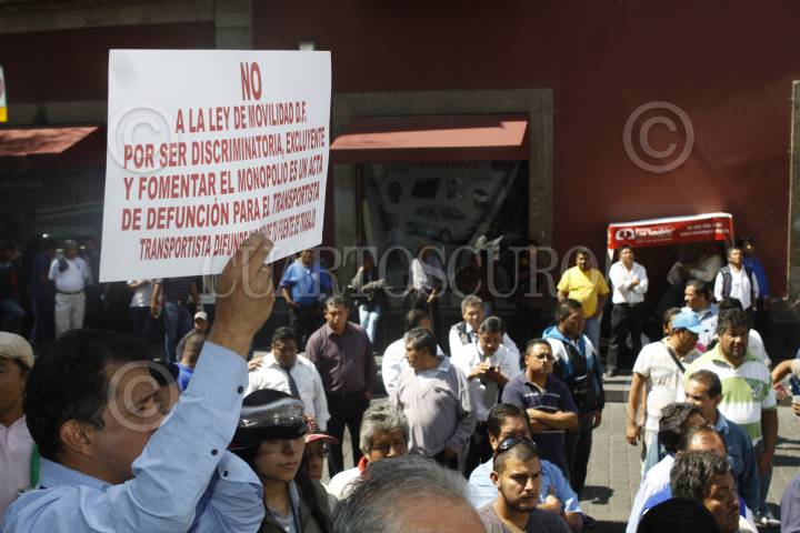 MÉXICO, D.F., 29ABRIL2014.- Organizaciones de transporte concesionario se manifestaron en oposición a la llamada Ley de Movilidad del DF afuera de la Asamblea Legislativa del DF, cual acusan de promover los monopolios en este rubro. FOTO: MOISÉS PABLO /CUARTOSCURO.COM
