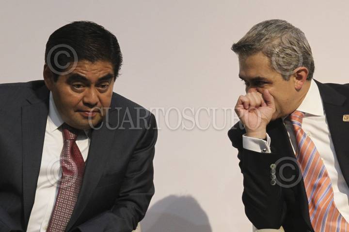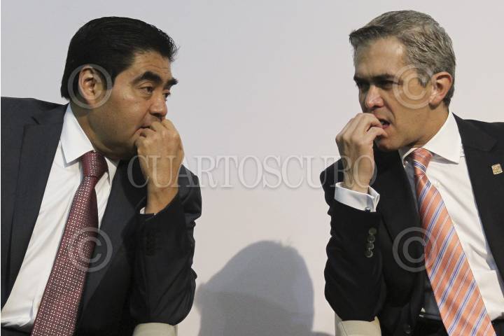 MÉXICO, D.F., 14JULIO2014.- Miguel G. Barbosa, coordinador de la bancada del PRD en el Senado de la República y Miguel Ángel Mancera, jefe de gobierno del Distrito Federal, durante la "Promulgación de la Ley de Movilidad", además de anunciar la renovación del transporte público, sin mencionar algún tiempo para ello. FOTO: ADOLFO VLADIMIR /CUARTOSCURO.COM