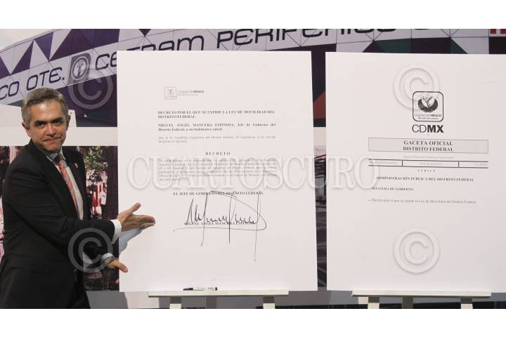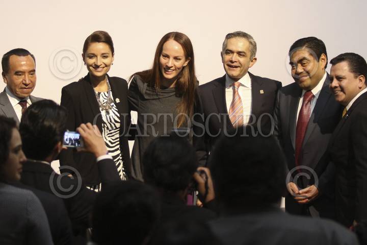 MÉXICO, D.F., 14JULIO2014.- Rufino H León Tovar, secretario de Movilidad, Laura Ballesteros, Asambleísta por el PAN, Gabriela Cuevas, senadora por el PAN, Miguel Ángel Mancera, jefe de gobierno del Distrito Federal, Miguel G. Barbosa, coordinador de la bancada del PRD en el Senado de la República, Manuel Granados, presidente de la Comisión de Gobierno del la Asamblea Legislativa, durante la "Promulgación de la Ley de Movilidad", además de anunciar la renovación del transporte público, sin mencionar algún tiempo para ello. FOTO: ADOLFO VLADIMIR /CUARTOSCURO.COM
