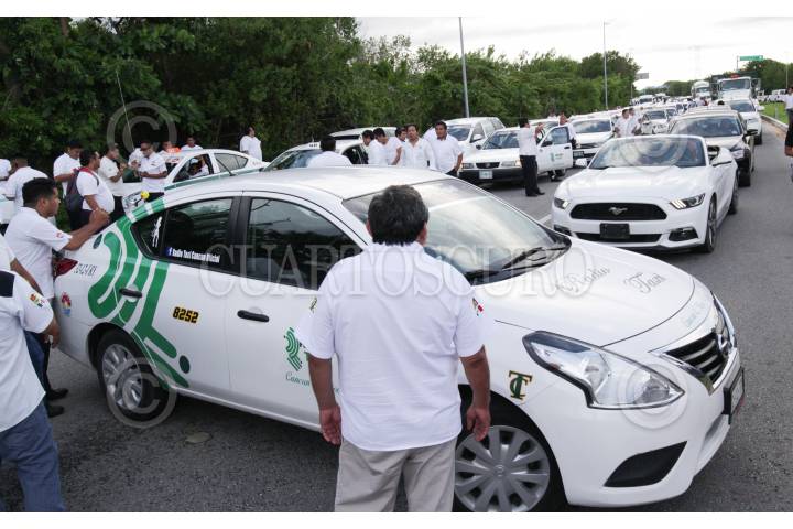 CANCÚN, QUINTANA ROO, 29MAYO2018.- El Congreso del Estado de Quintana Roo aprobó la Ley de Movilidad en el estado, que abre las puertas al servicio de transporte Uber que había cancelado sus operaciones en el estado. Decenas de taxistas bloquearon la entrada a la zona hotetelera para mostrar su rechazo a esta medida. FOTO: CUARTOSCURO.COM
