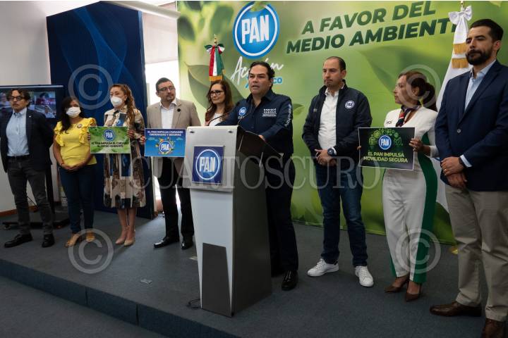 Marko Cortés, presidente del PAN, durante su participación la presentación de la Ley de Movilidad, realizada en las inmediaciones de este partido.