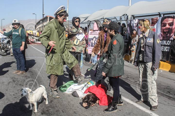 CIUDAD JUÁREZ, CHIHUAHUA, 16DICIEMBRE2017.- Organizaciones civiles, músicos, artistas y ciudadanos hicieron una manifestación en el Puente Internacional Santa Fe, que conecta a Ciudad Juárez con El Paso, Texas, en contra de la aprobación de la Ley de Seguridad Interior. El contingente de alrededor de 50 personas, marchó por las principales avenidas del Centro Histórico haciendo paradas en la Oficina de Enlace Legislativo de la Senadora Lilia Merodio y en las de los Comités Municipales del PRD y del PAN. FOTO: FAVIA LUCERO /CUARTOSCURO.COM