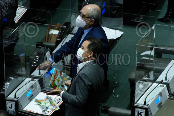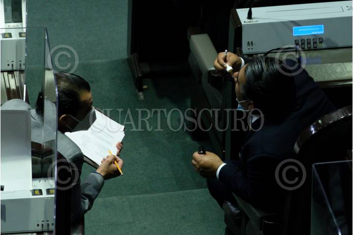 Ignacio Mier, diputado y coordinador de Morena, junto a Pablo Gómez, diputado de Morena, observar el tablero de votación al aprobarse la Ley Federal para la Regulación del Cannabis, y se reforman y adicionan diversas disposiciones de la Ley General de Salud y del Código Penal Federal.